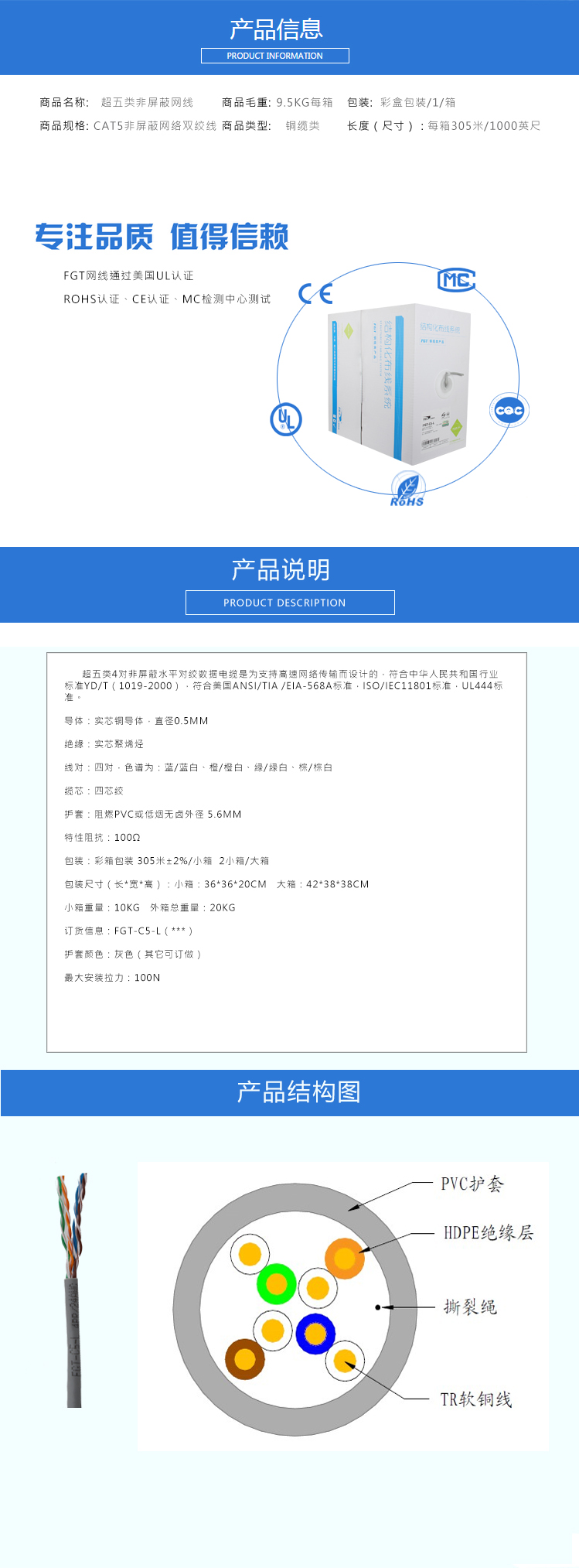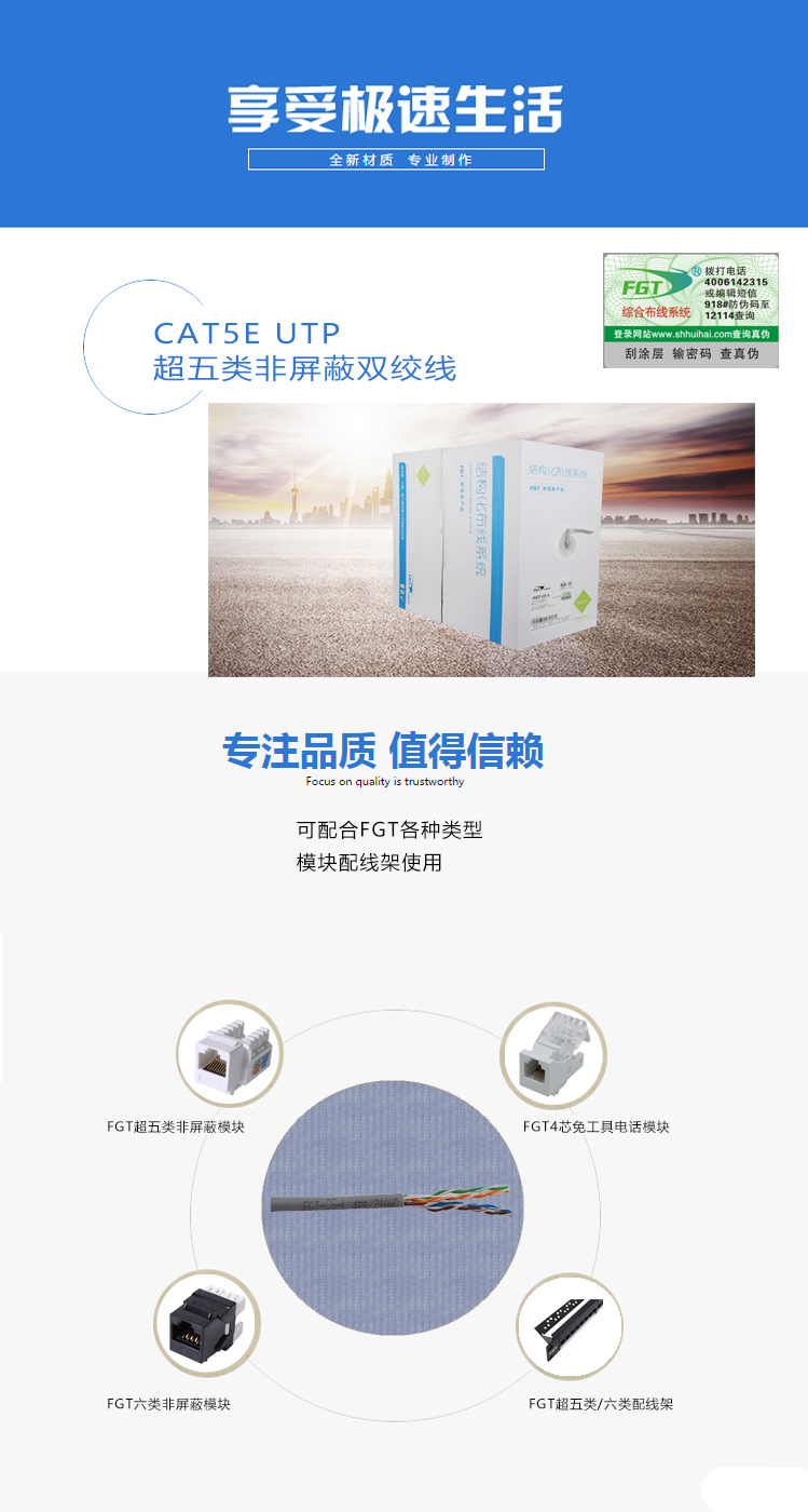 Cat.5e UTP CABLE are designed to support high-speed network transmission, reference standards: GB/T 50312, YD/T 1019, ISO/IEC 11801, ANSI/TIA-568.2-D.