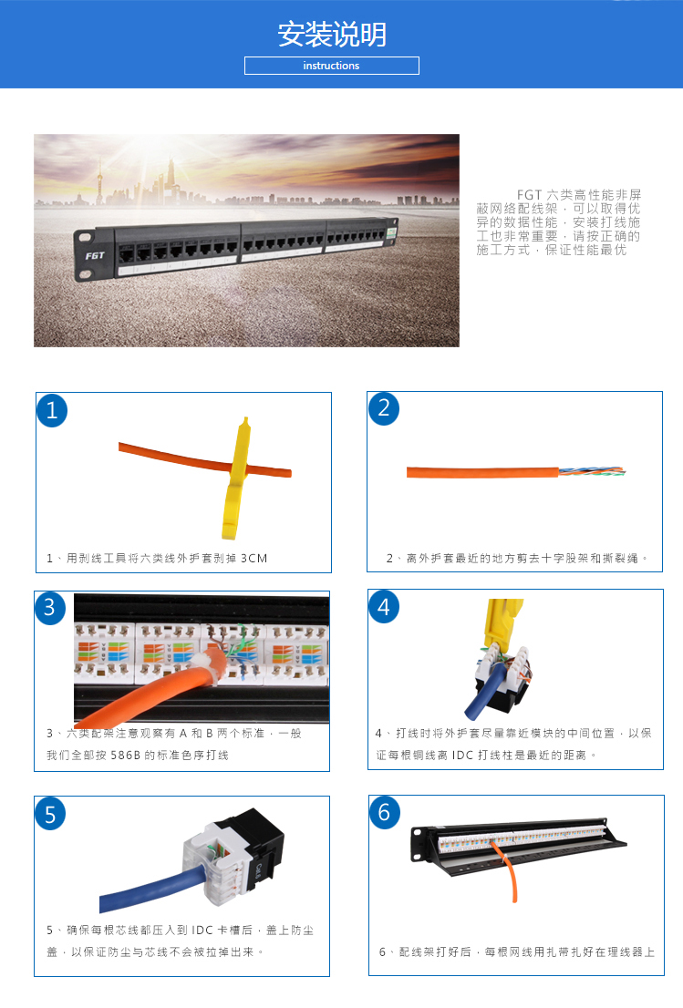 FGT六類網絡配線架該產品執行標準:YD/T 926.3ISO/IEC 11801 ANSI/TIA-568.2-DIEC 60603-7-4。支持話音通訊系統、10Base – T、16 Mbps 、100Base – T、155Mbps和622 Mbps ATM 、1000 Mbps、多媒體等方面的高速應用。
