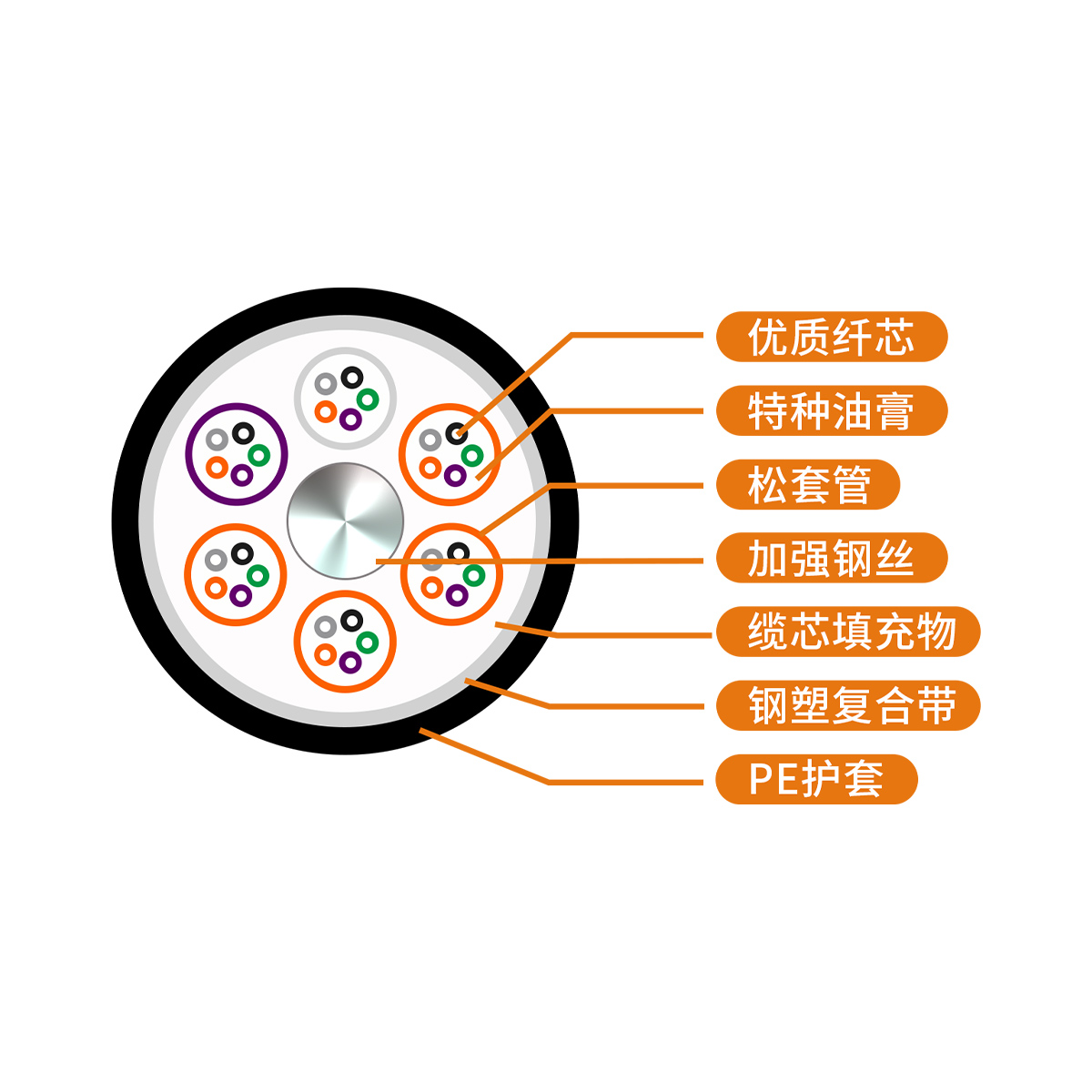 管內(nèi)充以特種油膏,對(duì)光纖進(jìn)行了關(guān)鍵性保護(hù),松套管內(nèi)填充特種防水化合物