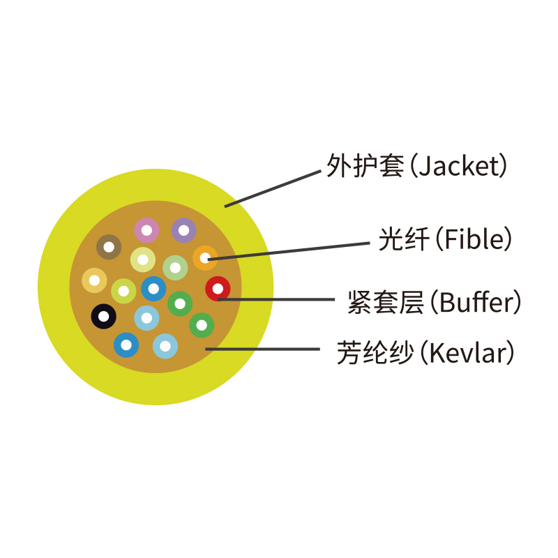 結構:緊套光纖由光纖涂覆層表面緊套一層或多層被覆層構成,便于剝離使用,光纜套管內置多股芳綸加強構件、具有良好的機械保護性能和抗拉力